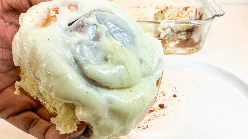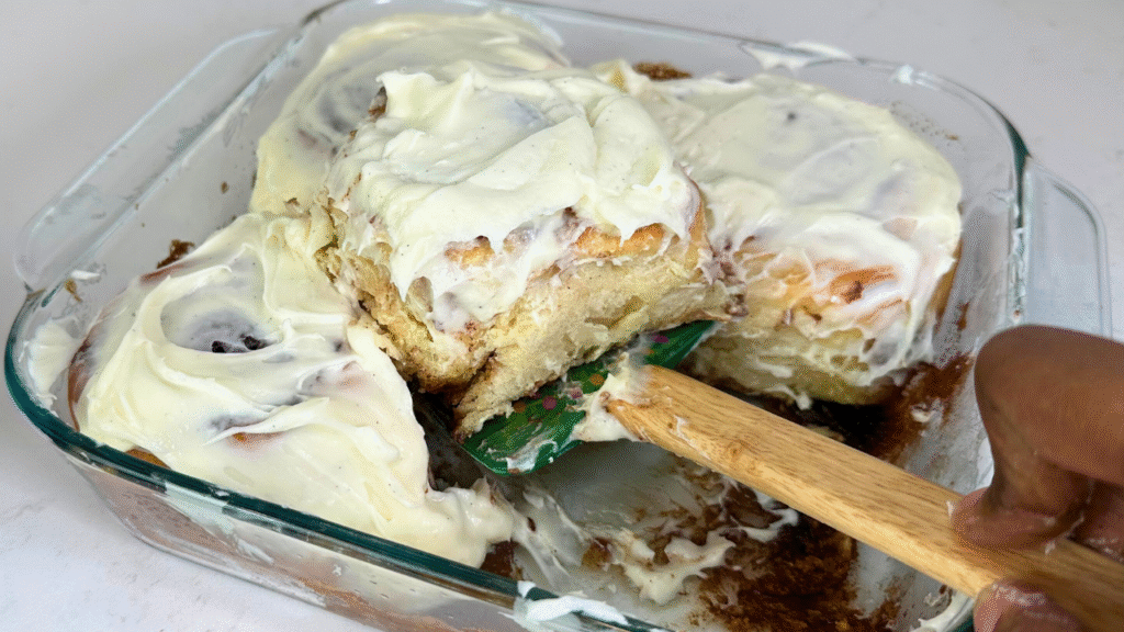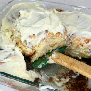 • Spread the frosting over the warm rolls so it melts into all the layers. Serve immediately and enjoy!